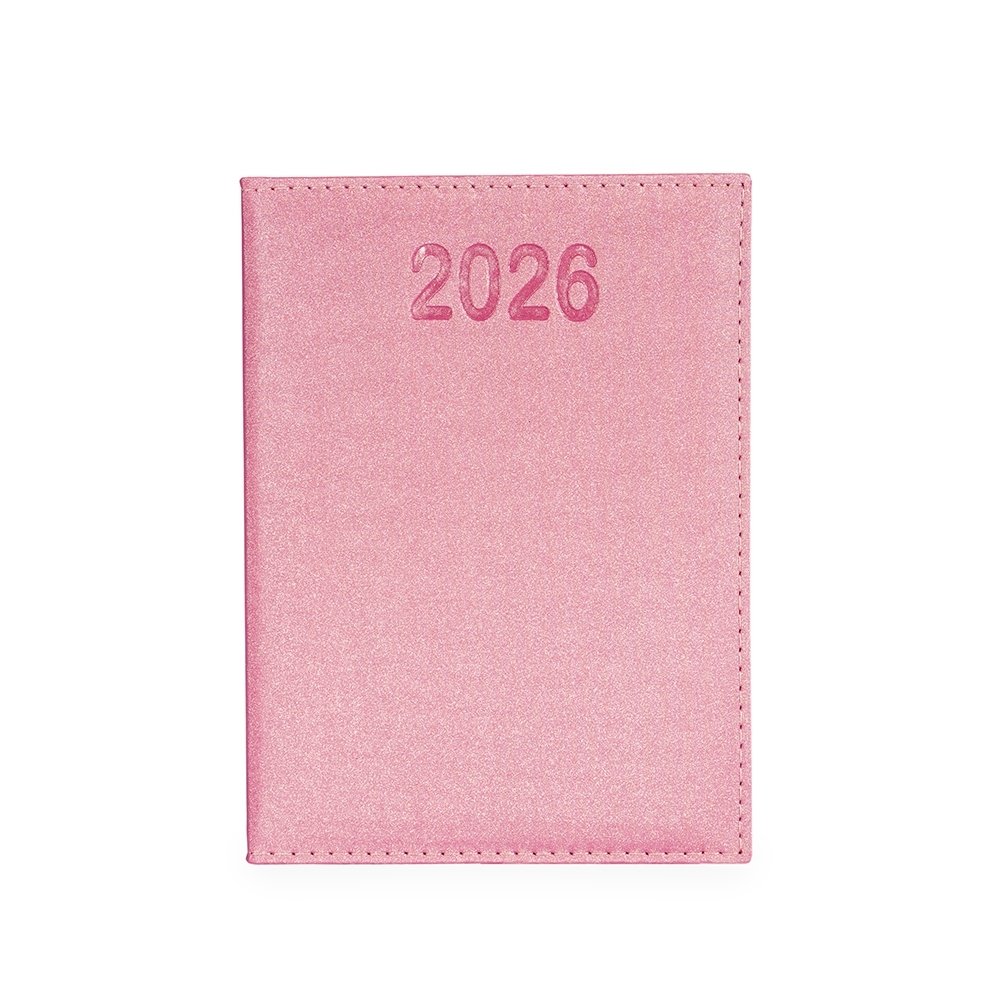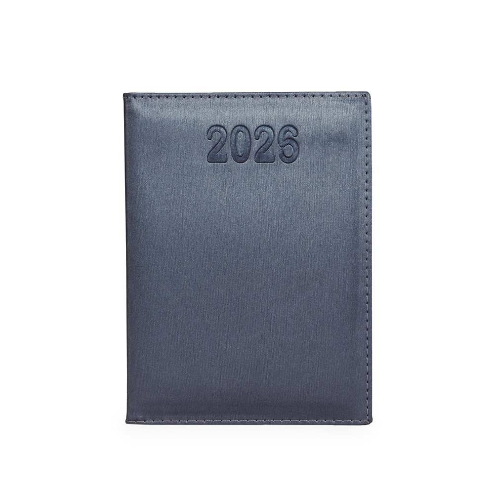 Agenda diária 2026 com capa em couro sintético metalizado e marca-páginas em fita de cetim. Possui páginas dedicadas a dados pessoais, calendários de 2025 a 2027, lista de contatos, planejamento diário e mapas.