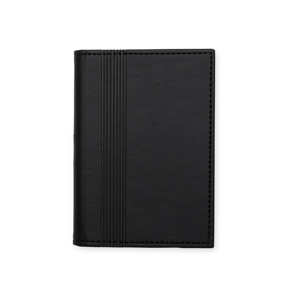 Caderneta em couro sintético com porta caneta e compartimento para arquivar folhas. Possui aproximadamente 80 folhas marfim sem pauta.