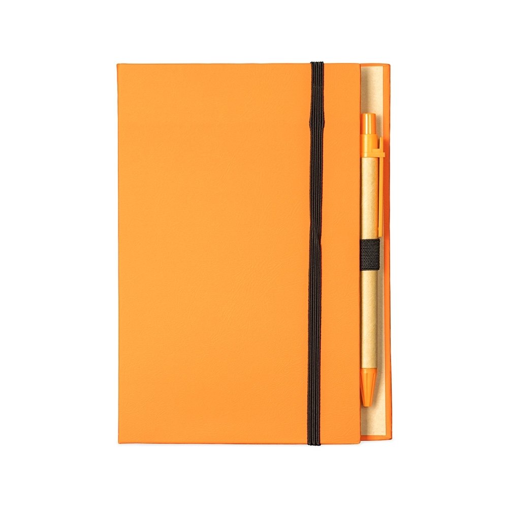 Um bloco de anotações com capa revestida em papel especial e fita elástica para fechamento. Contém aproximadamente 80 folhas amareladas destacáveis com pauta, além de um bloco com cerca de 20 folhas autoadesivas amarelas e aproximadamente 100 marcadores de página autoadesivos, divididos em cinco cores diferentes. Acompanha uma caneta esferográfica com carga azul de 1.0mm e acionamento por clique, corpo em papelão e demais componentes em plástico.