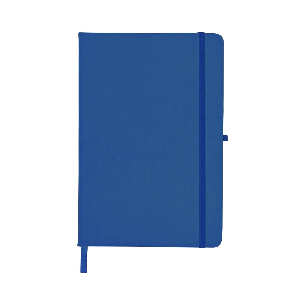 Caderneta emborrachada com porta caneta elástico em nylon, marcador de página em cetim e fita elástica de nylon para fechar. Contém aproximadamente 80 folhas pardas sem pauta.
