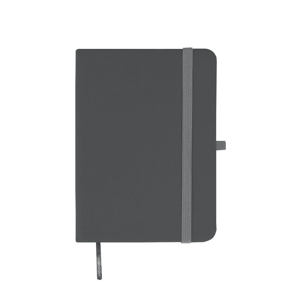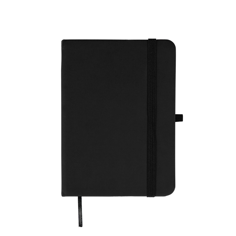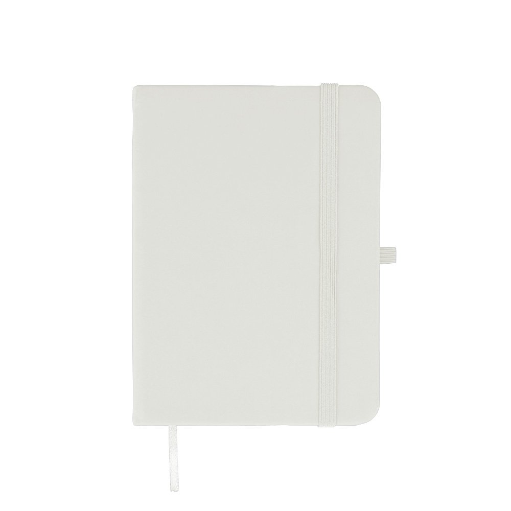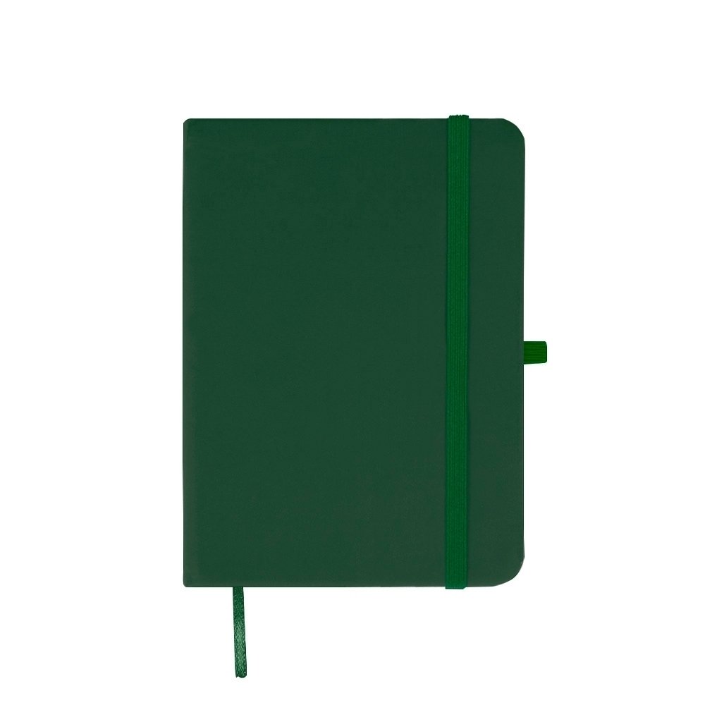 Caderneta emborrachada com elástico para lacre, marcador de página em cetim e porta caneta, contém aproximadamente 84 folhas marfim sem pauta.