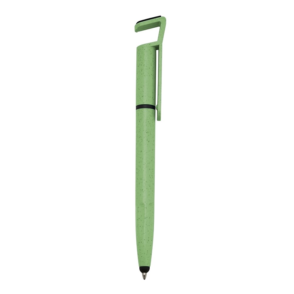 Caneta fibra de bambu com suporte para celular, ponteira touch screen e limpador de tela. Carga esferográfica azul e acionamento por rotação. OBS.: PEDIDOS MÍNIMO DE 50 PEÇAS!