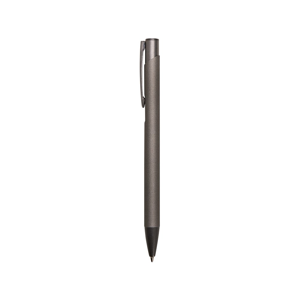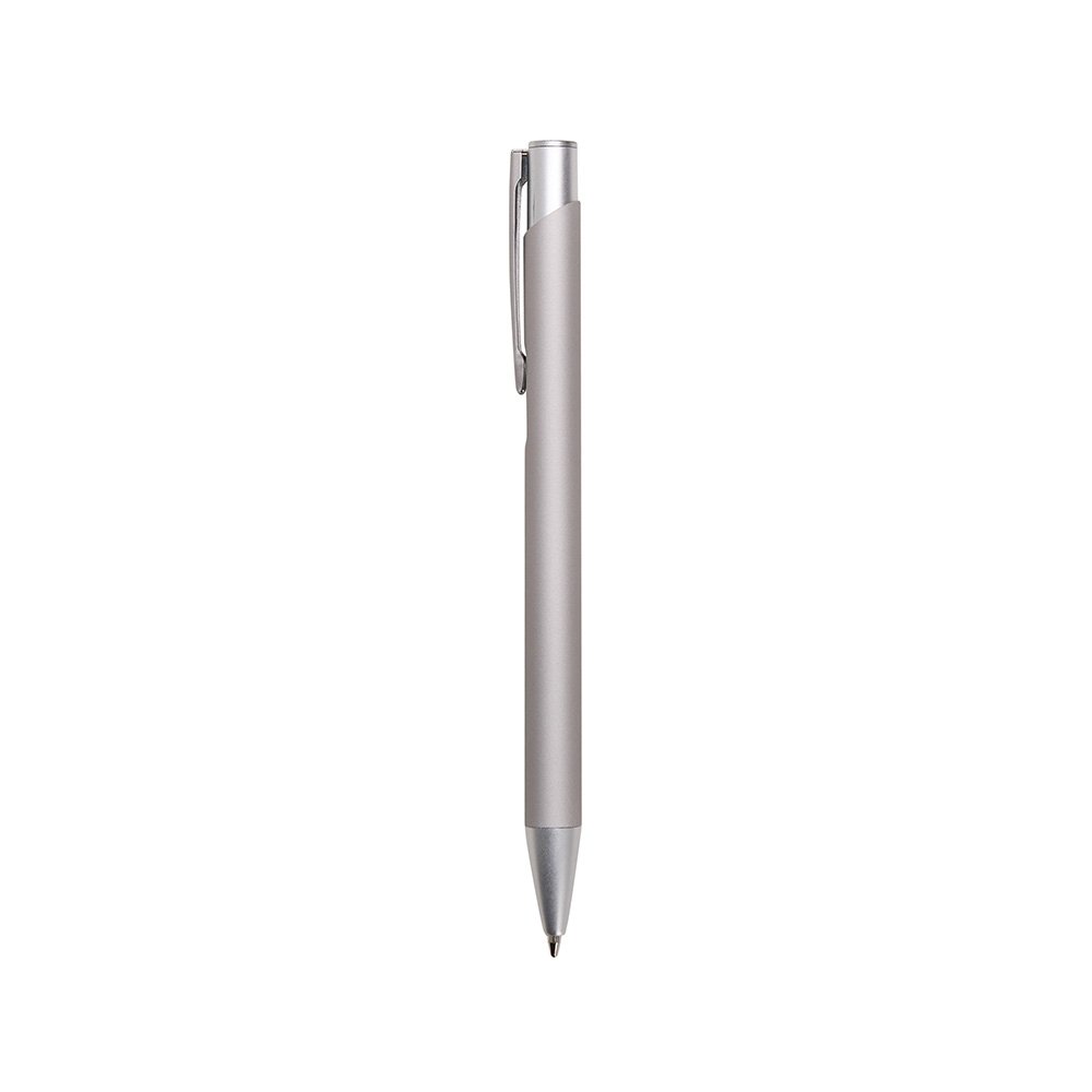 Caneta metálica com ponta e clip em plástico. Possui acionamento por clique e carga esferográfica azul de 1.0mm.