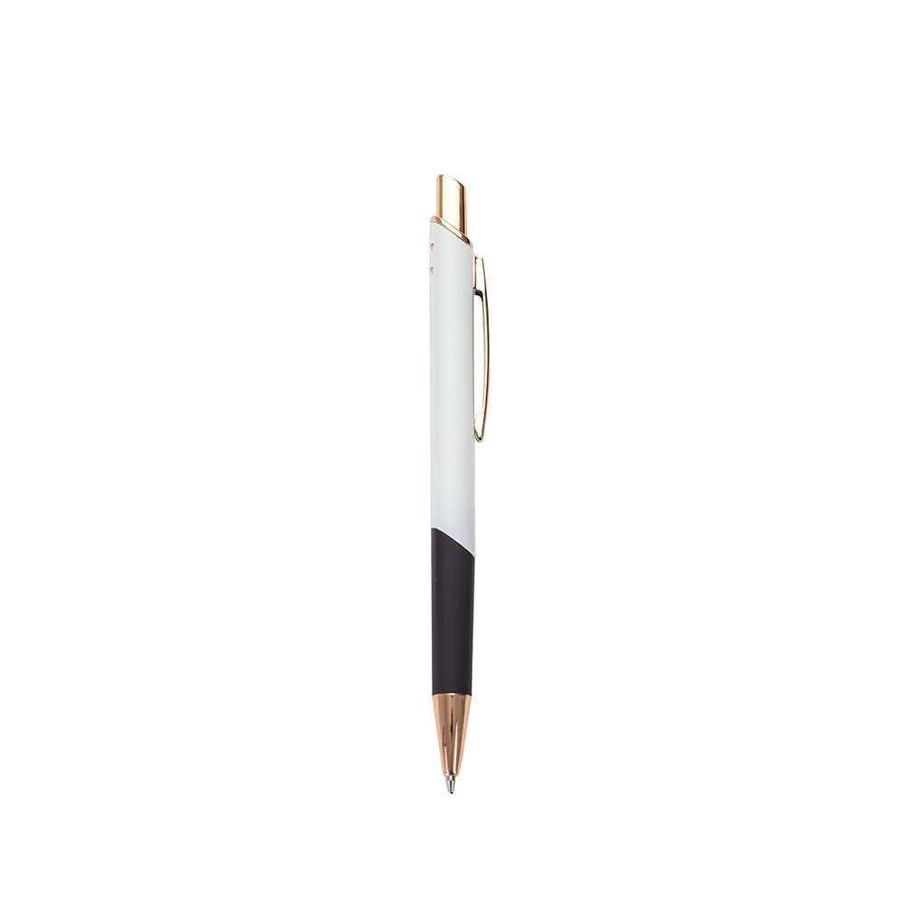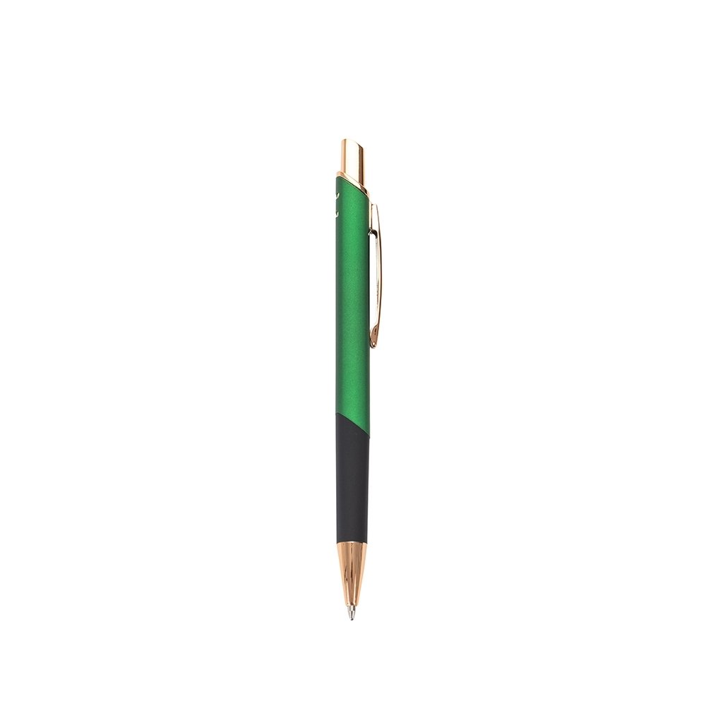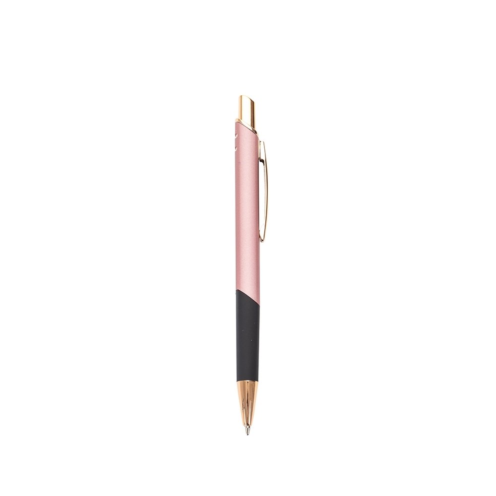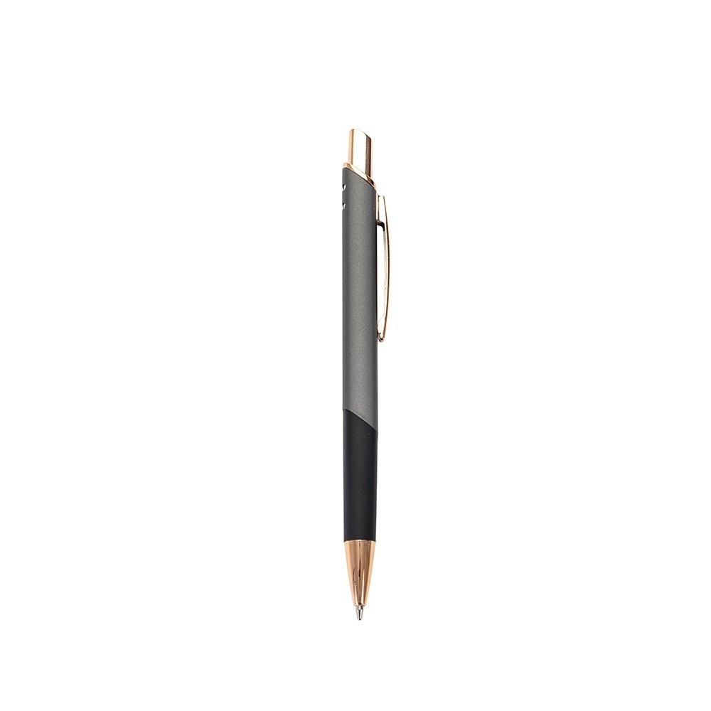 Caneta feita inteiramente em metal com acionamento por clique e carga esferográfica azul de 1,0mm.