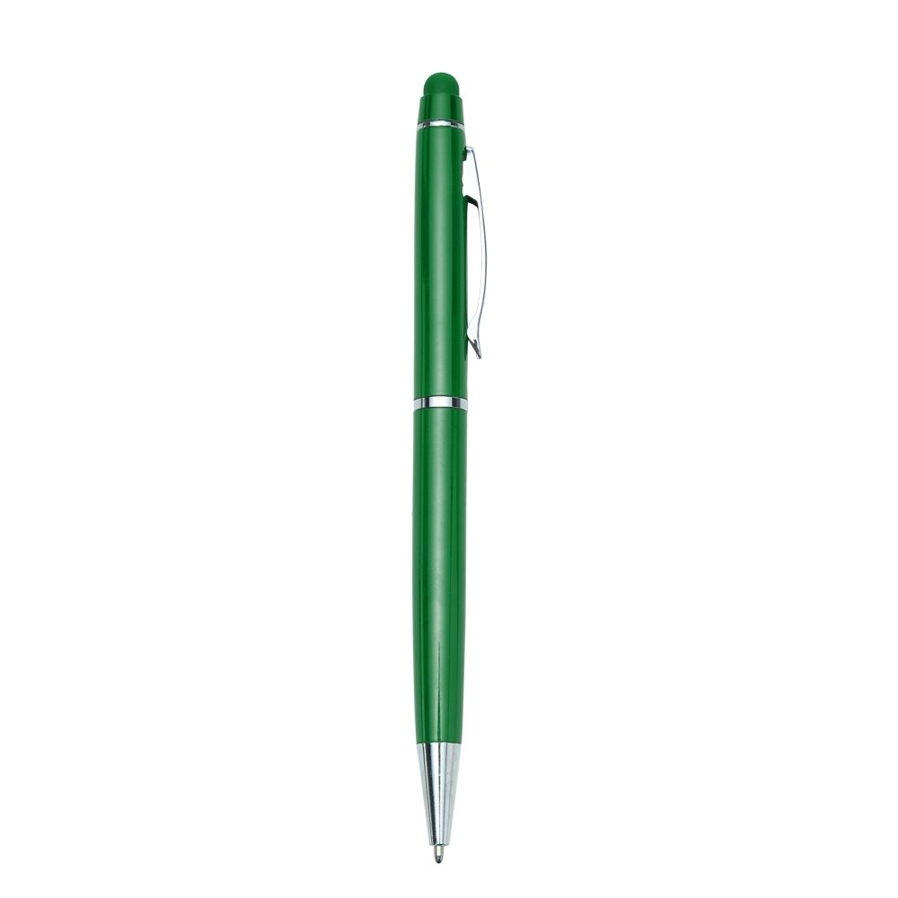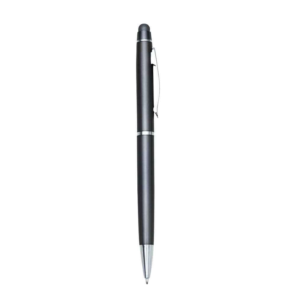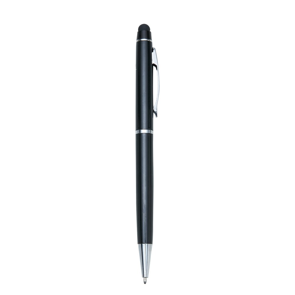 Caneta metal com touch screen, carga esferográfica azul e acionamento por rotação.