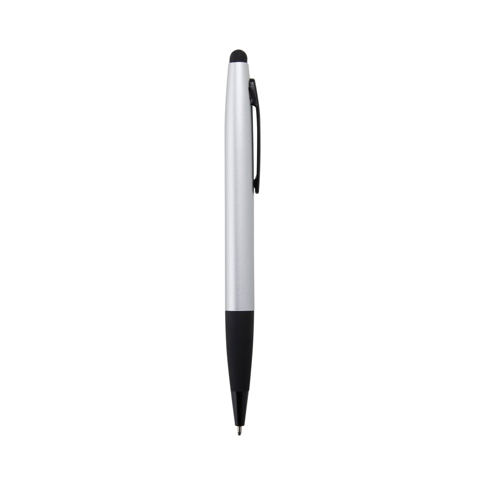 Caneta metálica com touchscreen, carga esferográfica azul 1.0mm e acionamento por rotação.