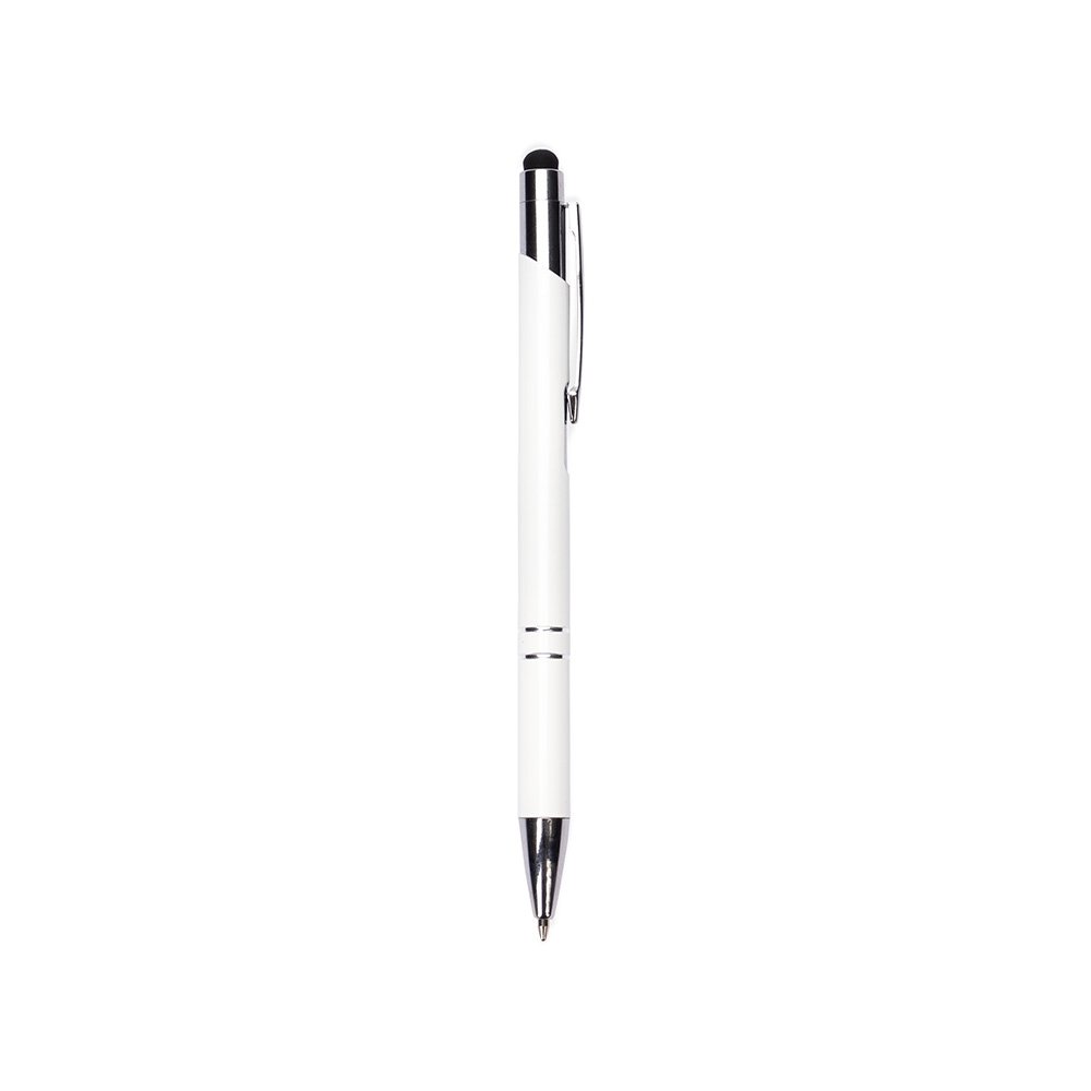 Caneta esferográfica de carga azul de 1,0mm. Possui construção inteira em metal e acionamento por clique que proporciona um toque leve para escrita. Além disso, sua ponteira emborrachada permite o uso como uma caneta touch para interação com dispositivos com telas touchscreen.