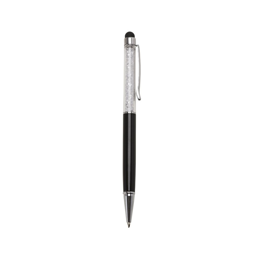 Caneta metálica com touch screen e detalhes em cristal, carga esferográfica azul e acionamento por rotação.