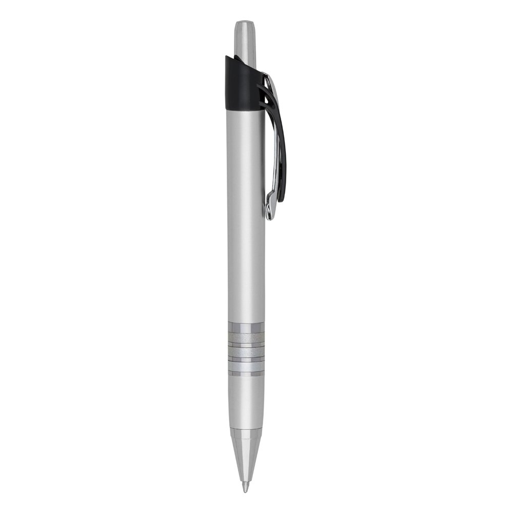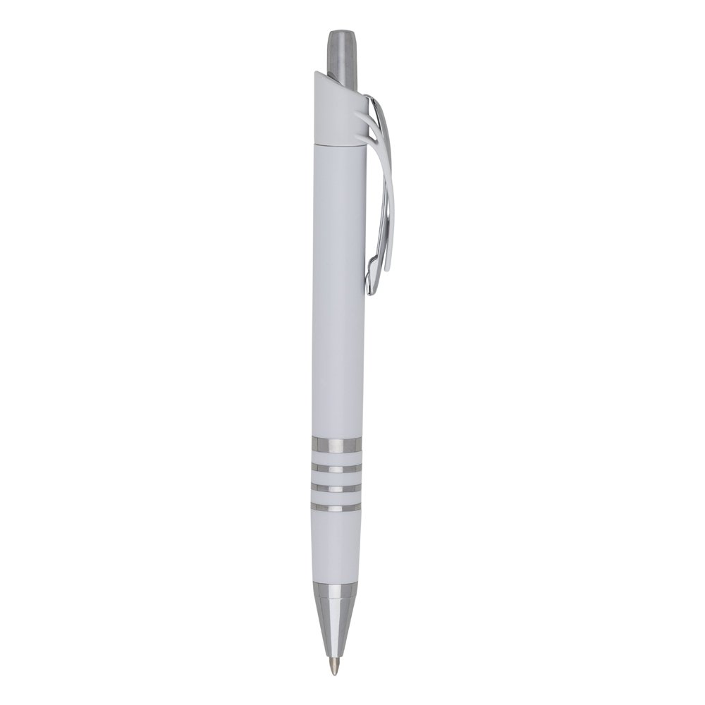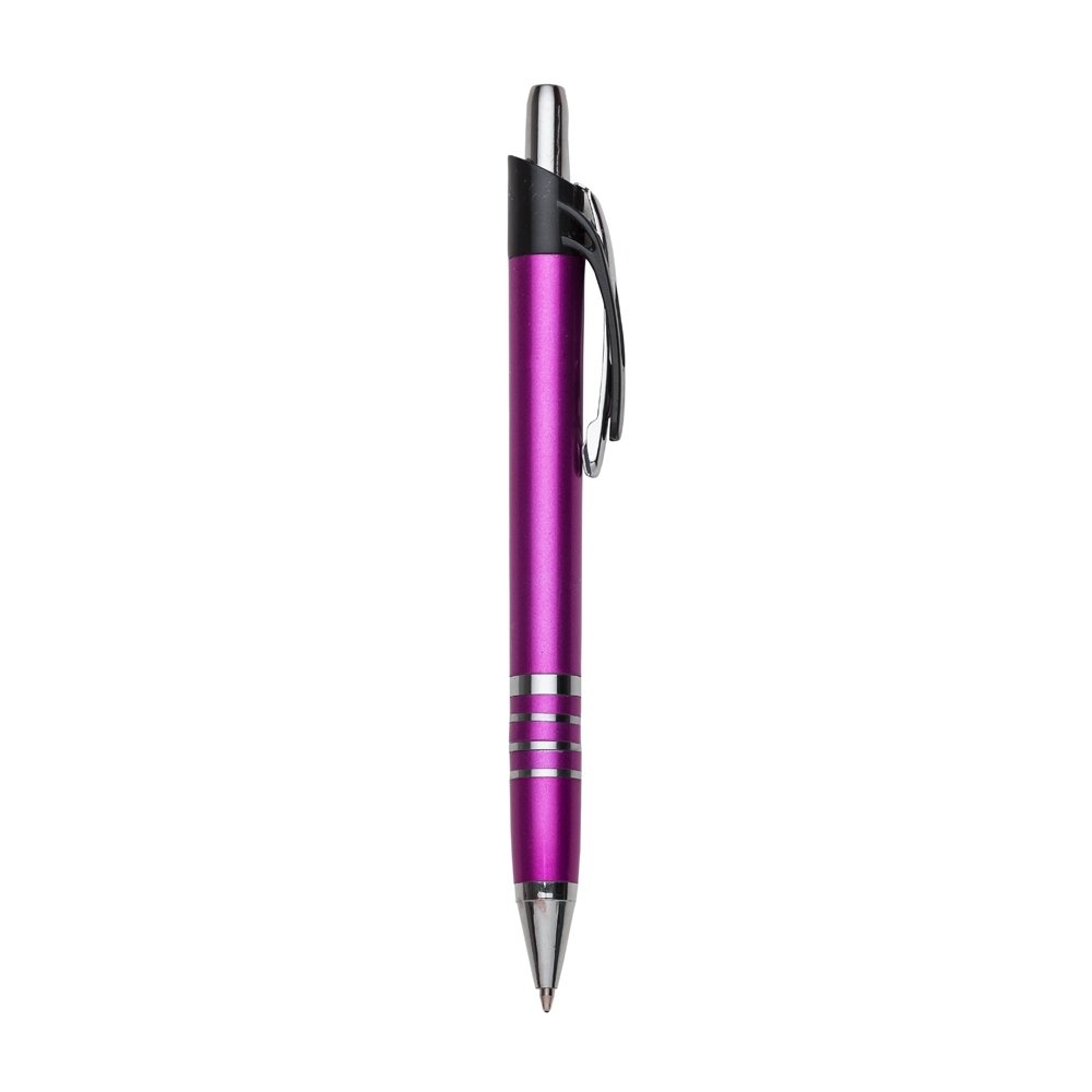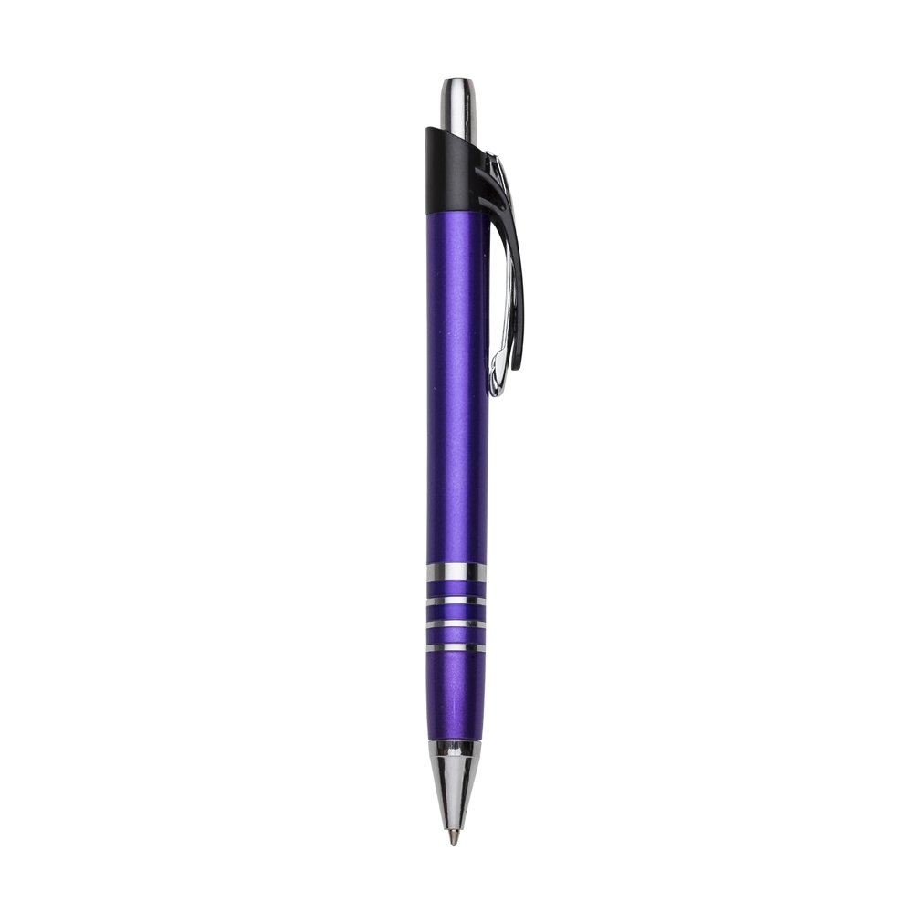 Caneta plástica com carga esferográfica azul 1.0 mm e acionamento por clique.