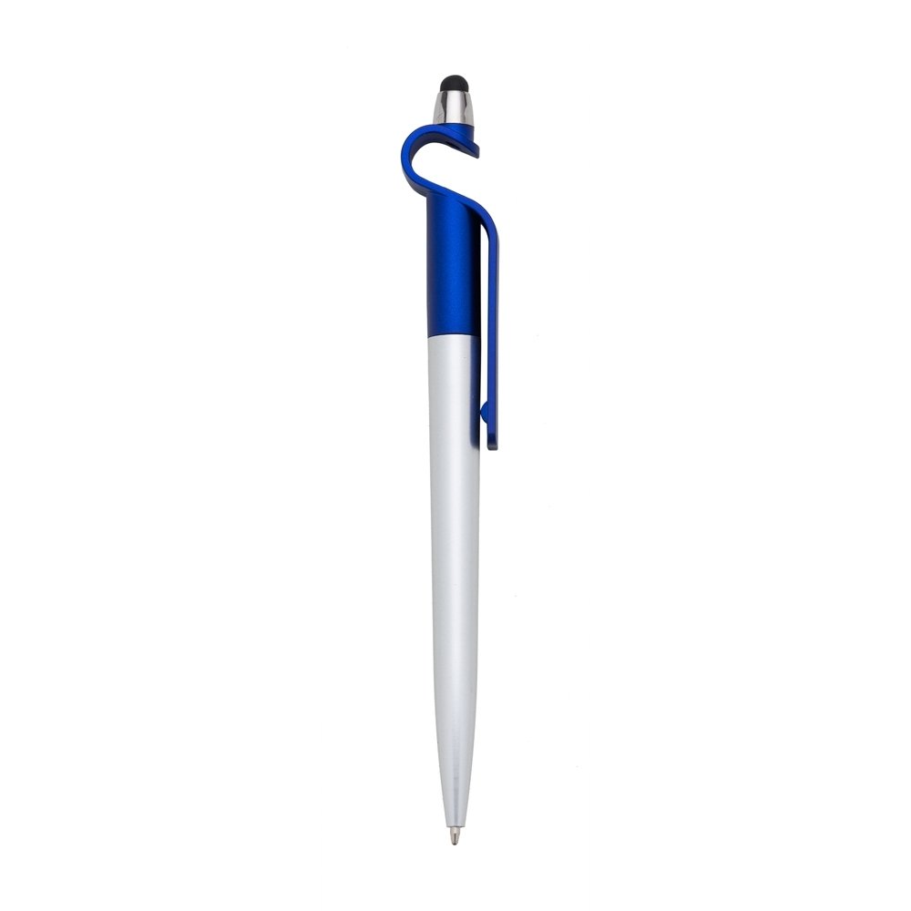 Caneta plástica com suporte para celular e touch screen. Carga esferográfica azul e acionamento por rotação. OBS.: PEDIDOS MÍNIMO DE 50 PEÇAS!