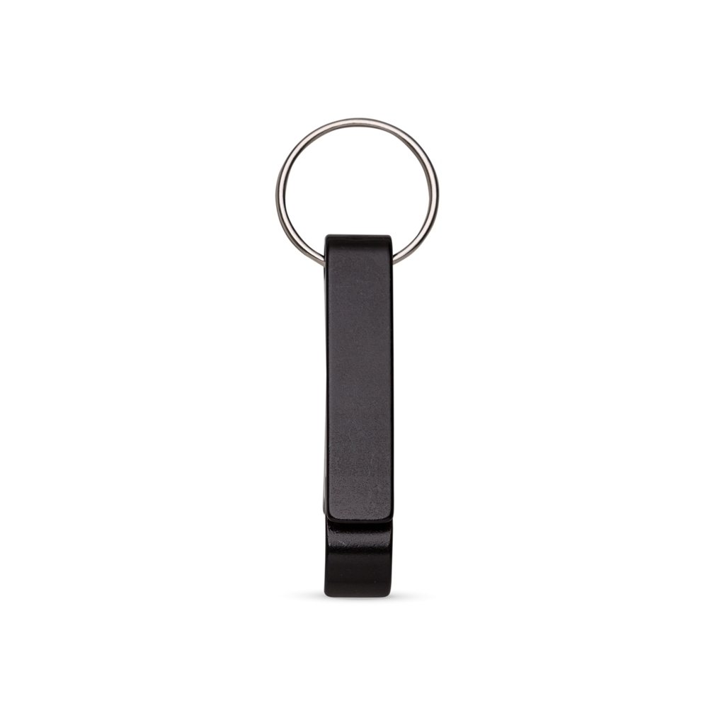 Chaveiro metálico com abridor de garrafas e argola de ferro niquelado.