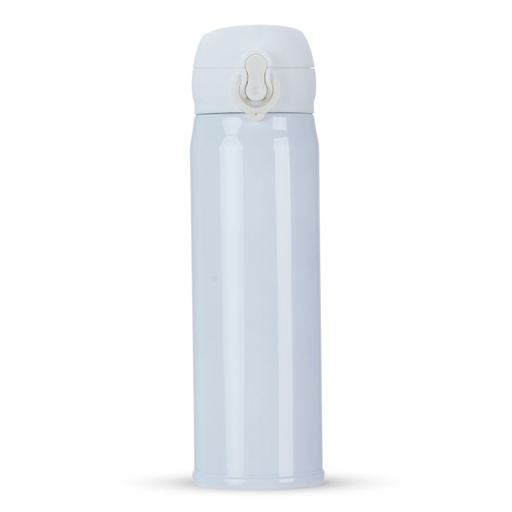 Garrafa térmica de 400ml de inox colorida com botão e válvula para abertura. Possui um sistema de trava (basta mover para cima/baixo para abrir/fechar), pressione o botão central para abrir a tampa(possui na parte interna borracha protetora evitando vazar o líquido). Para abrir a tampa por completo basta rosqueá-la, parte interna revestida em inox. Na embalagem do produto pode ir especificado a capacidade de 450ml ou 500ml devido aos fabricantes que trabalham terem impresso a descrição deste modo, porém ressalvamos a capacidade correta de 400ml.