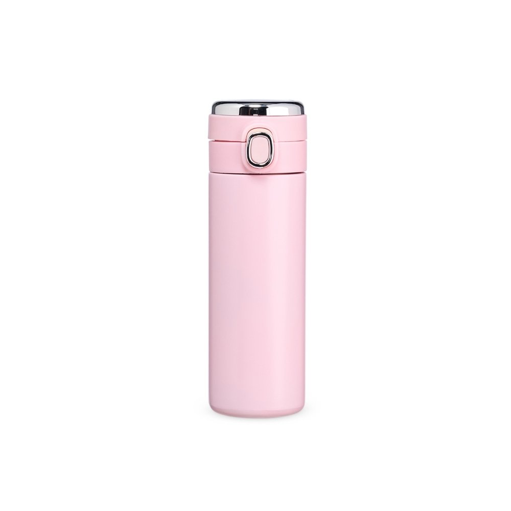 Garrafa térmica em inox 304 com parede dupla, com capacidade de 400ml. Possui tampa com botão de acionamento e área superior para personalização, além de película protetora para evitar arranhões.