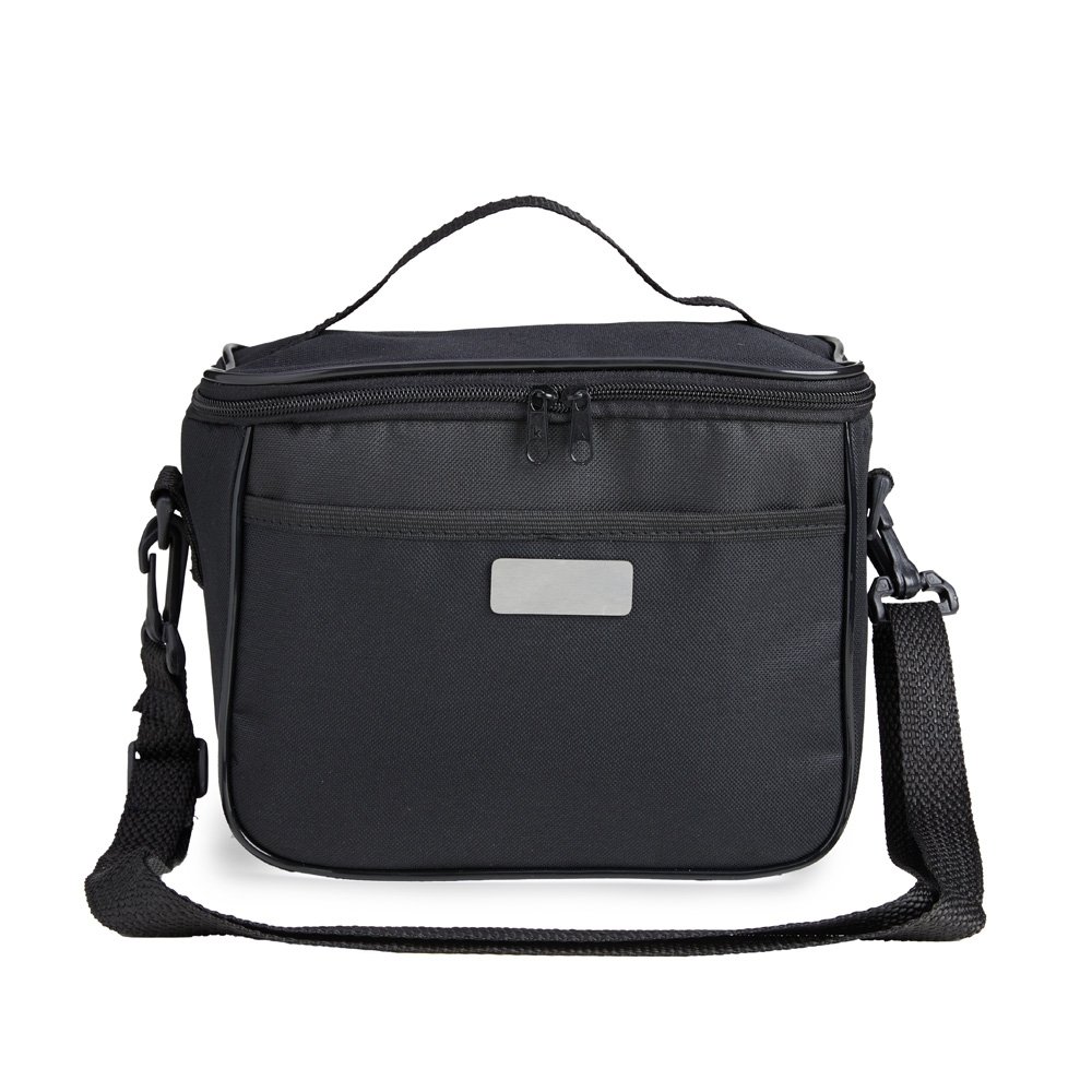 Bolsa térmica 6 litros com bolsos externos e alça de mão em nylon, contém bolso frontal aberto e bolso traseiro com zíper. Acompanha plaquinha metálica e alça transversal regulável com mosquetões para encaixe nas fivelas laterais da bolsa.
