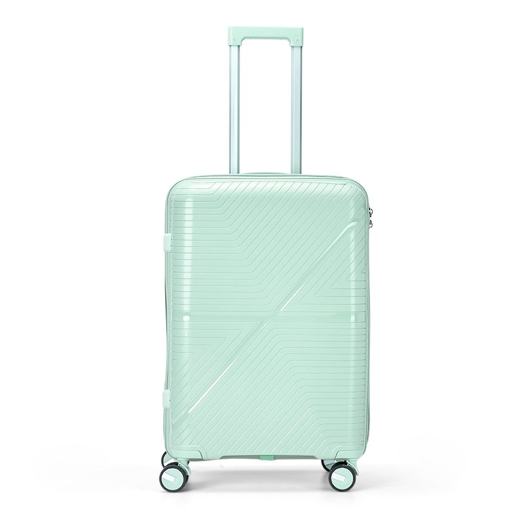 Mala de viagem em plástico resistente com capacidade de até 67 litros. Possui espaço interno com divisória, que contém bolso em tela e outro espaço com cinta compressora para organização de objetos. Conta com duas alças de mãos, uma superior e outra lateral, quatro apoios laterais, quatro rodinhas com giro em 360º, puxador com ajuste de nível e cadeado numérico TSA.