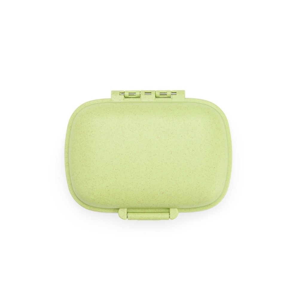 Porta-comprimidos compacto feito em plástico obtido da palha de trigo e anel de vedação para as bordas em silicone. Possui oito compartimentos com tampas removíveis, sendo dois maiores com capacidade de até 30ml e seis menores com até 10ml cada. Acompanha palheta multiuso.
