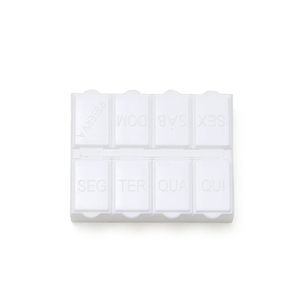 Porta comprimidos semanal de plástico branco fosco. Possui oito divisórias, sete delas escrito em relevo os dias da semana e a última escrito reserva. Verso liso. OBS.: PEDIDO MÍNIMO DE 50 PEÇAS!