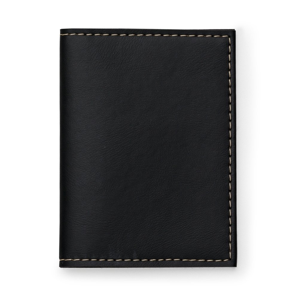 Porta-documento Bidins em couro sintético, capa frente e verso lisa, parte interna com bolso de visor plástico e três divisórias no próprio couro com bolso lateral.