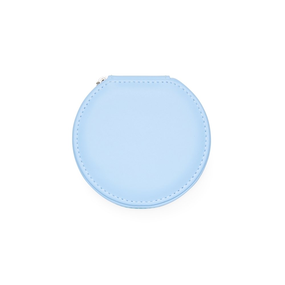 Porta-joias arredondado feito em couro sintético com revestimento aveludado e fechamento em zíper. Possui bolso elástico e três ganchos pequenos na parte interna da tampa, além de divisória multiuso e repartição almofadada com ranhuras para anéis, ambos localizadas no compartimento principal.
